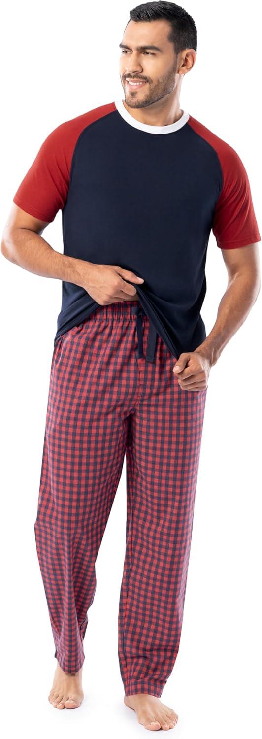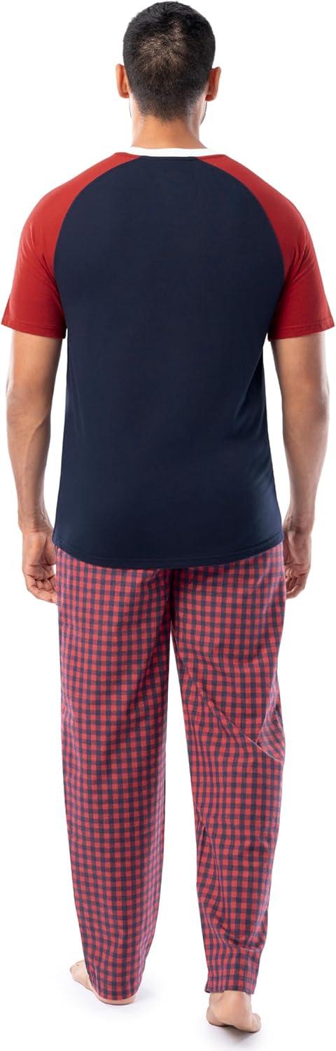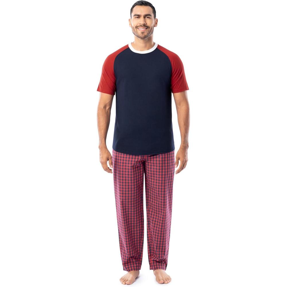 Fruit of the Loom Men’s Jersey Henley Top and Broadcloth Pant Sleep Pajama Set(Navy/Red Plaid)