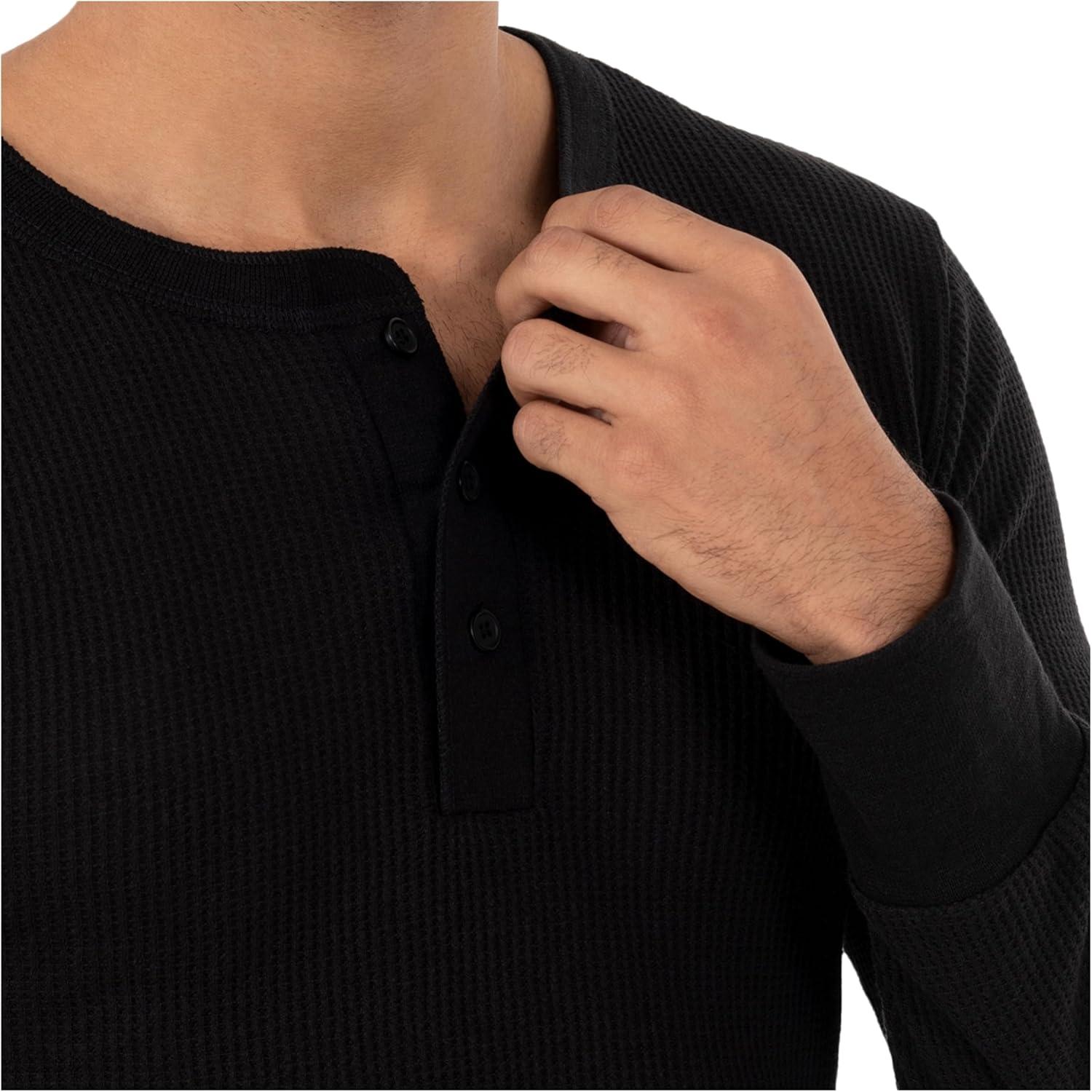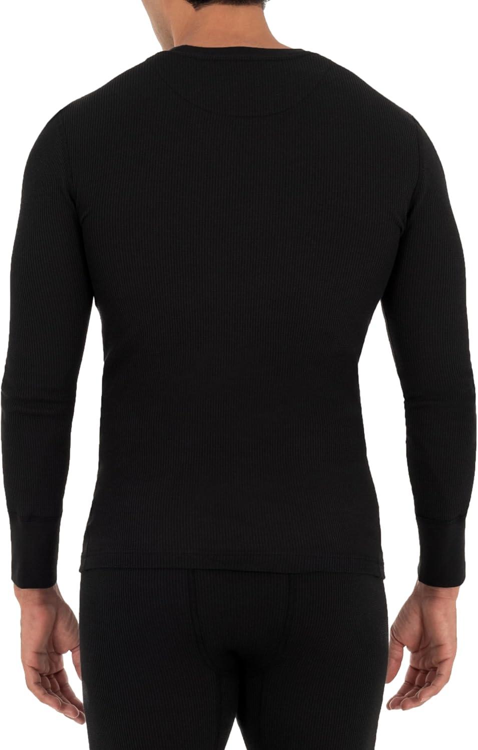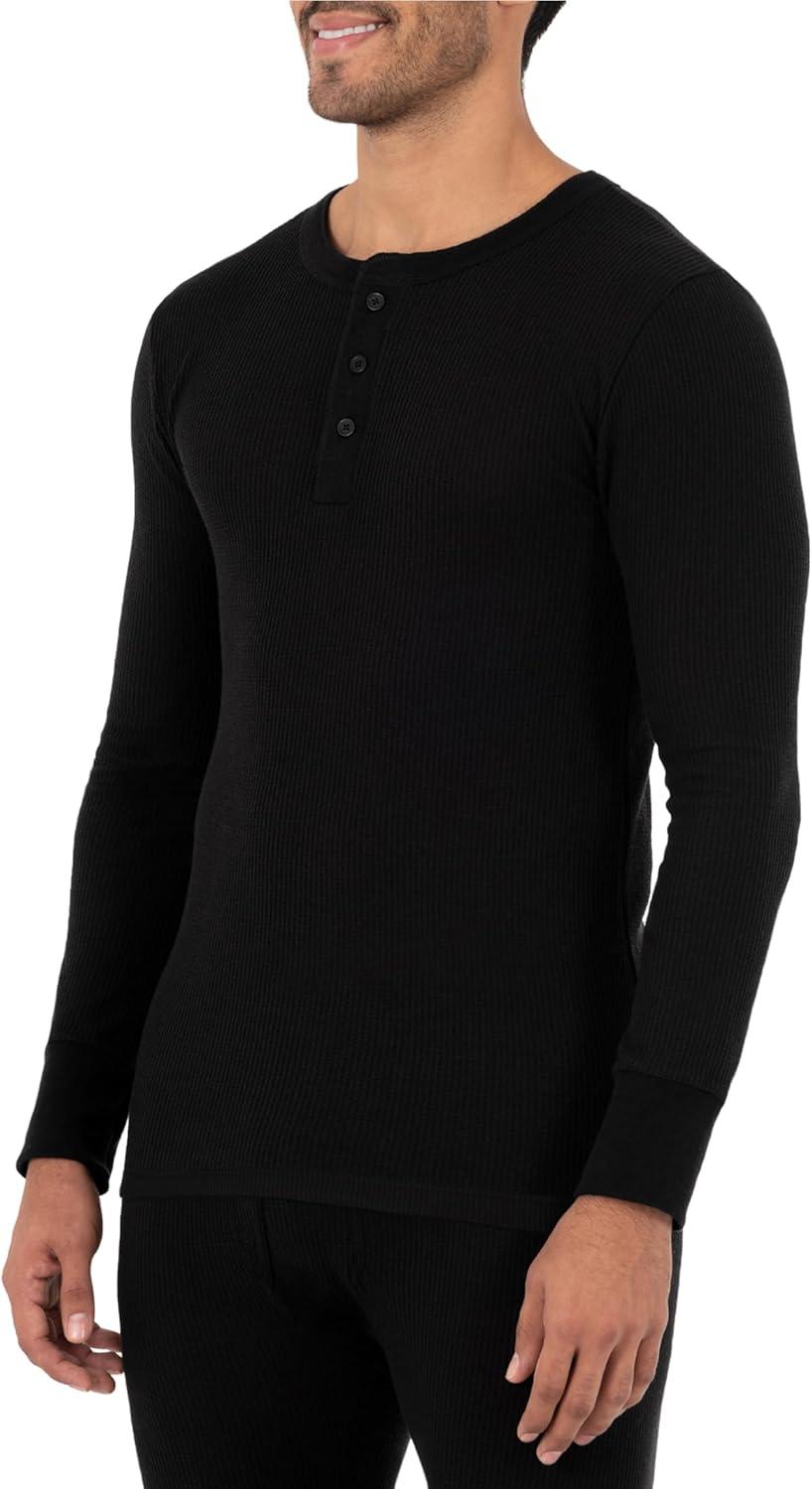 Fruit of the Loom Mens Recycled Waffle Thermal Underwear Henley Top (1 and 2 Packs)(Black)