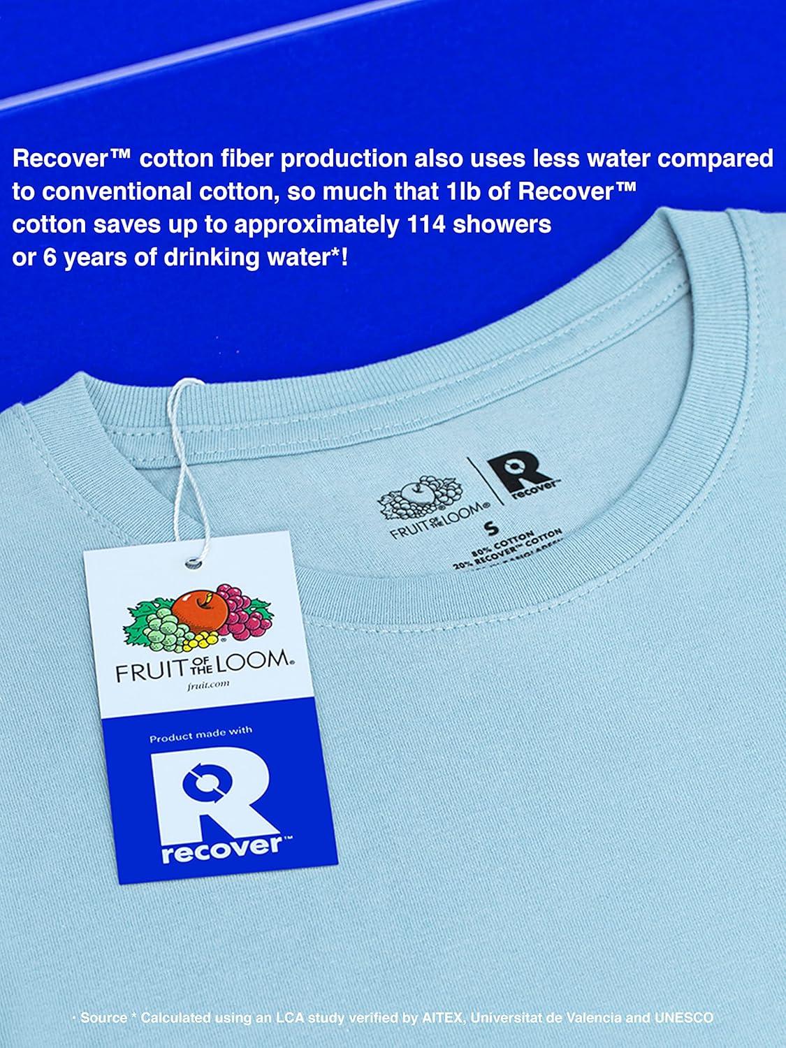 We are committed to a more Fruitful Future. In doing so we are big on turning things into other things! So, we partnered with Recover™ to create our Fruit of the Loom Recover™ Cotton T-shirt. This T-shirt is made with 20% Recover™ cotton, a high-quality, low-impact recycled fiber made from cotton textile waste. Recover™ cotton fiber production also uses less water compared to conventional cotton, so much that 1lb of Recover™ cotton saves up to approximately 114 showers or 6 years of drinking water*! This unisex cotton t-shirt provides more than just saving Earth – it’s made to last with double-needle stitching for extra re-enforcement. The shoulder-to-shoulder cover seam tape ensures your comfort. This sustainable t-shirt is a must-have for your drawer and as always, we provide the best fit, guaranteed! * Calculated using an LCA study verified by AITEX, Universitat de Valencia and UNESCO.