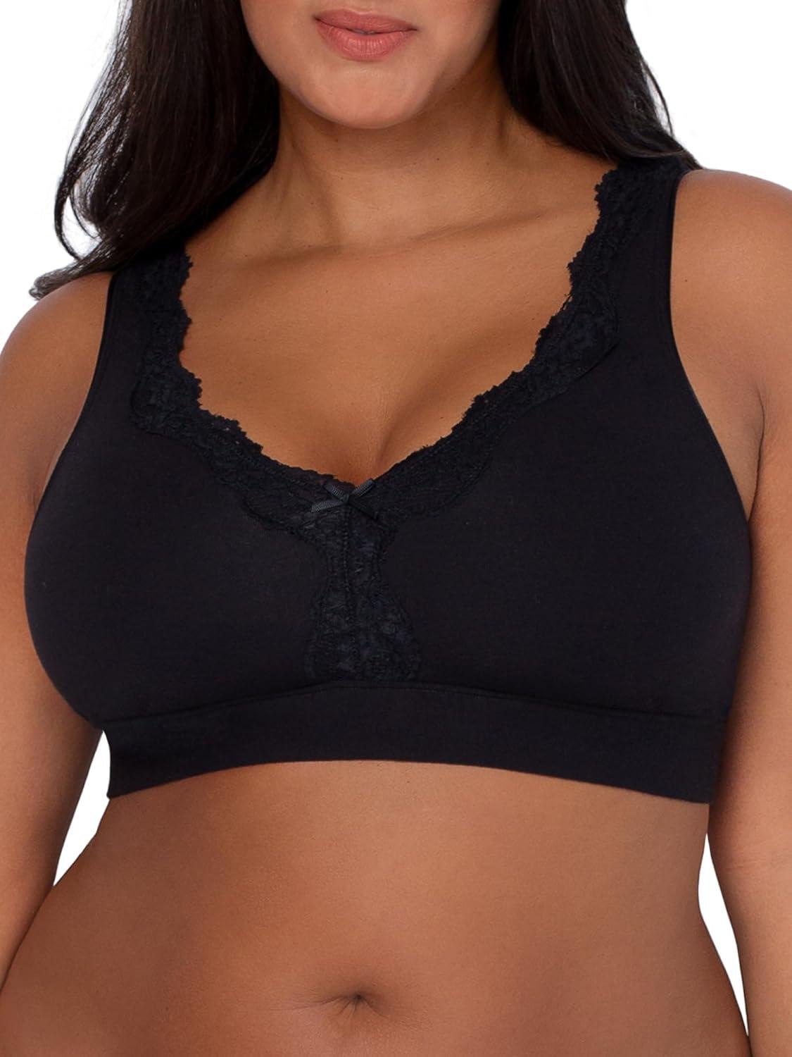 The Fruit of the Loom Women’s Full Coverage Wireless Cotton Bralette 2 Pack is designed with comfy, stretch cotton fabric. All-day comfort you can’t live without, this bralette without an underwire is made to shape and support. Double lined, full coverage, wireless cups give you lasting support throughout the day. This wire-free bra has an elastic under band that provides a flexible fit and added support. The best wireless bra, it’s complete with comfortable, extra wide straps, a smoothing leotard style back and a soft, adjustable back closure so you can customize your fit. Lace trim and center bow finish the look.