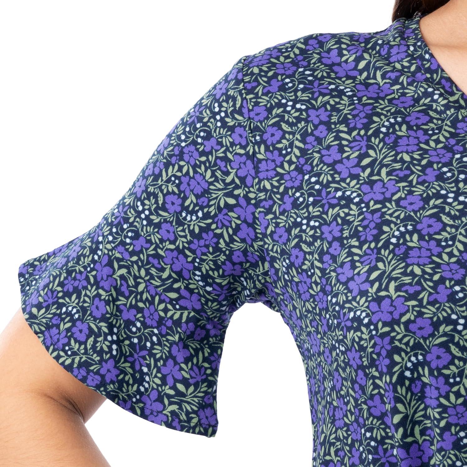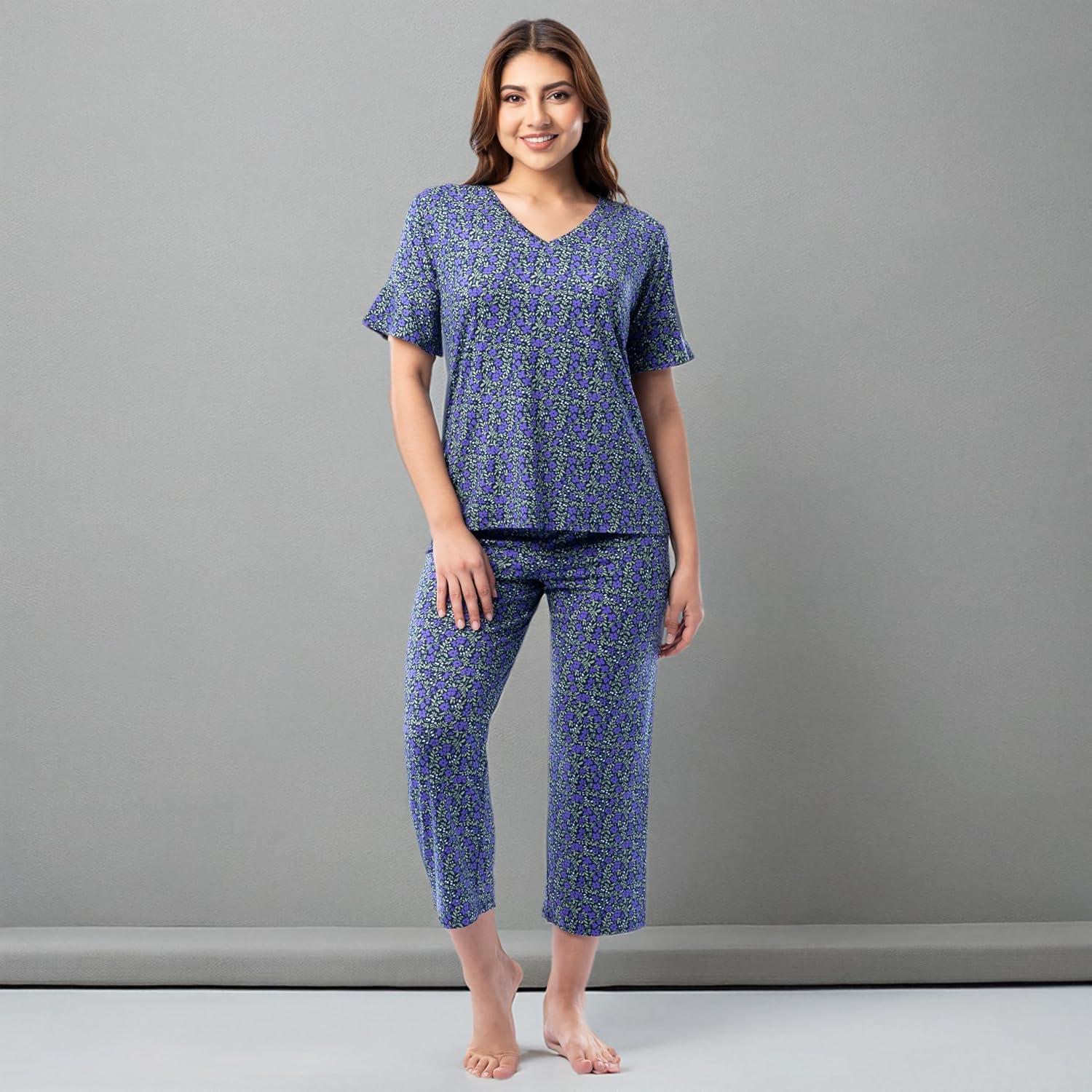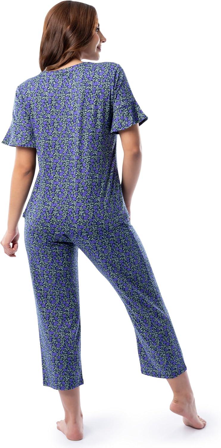Fruit of the Loom womens 360 Stretch Ruffle Sleeve V-neck Tee and Capri Sleep Pajama Set(Small Bloom)