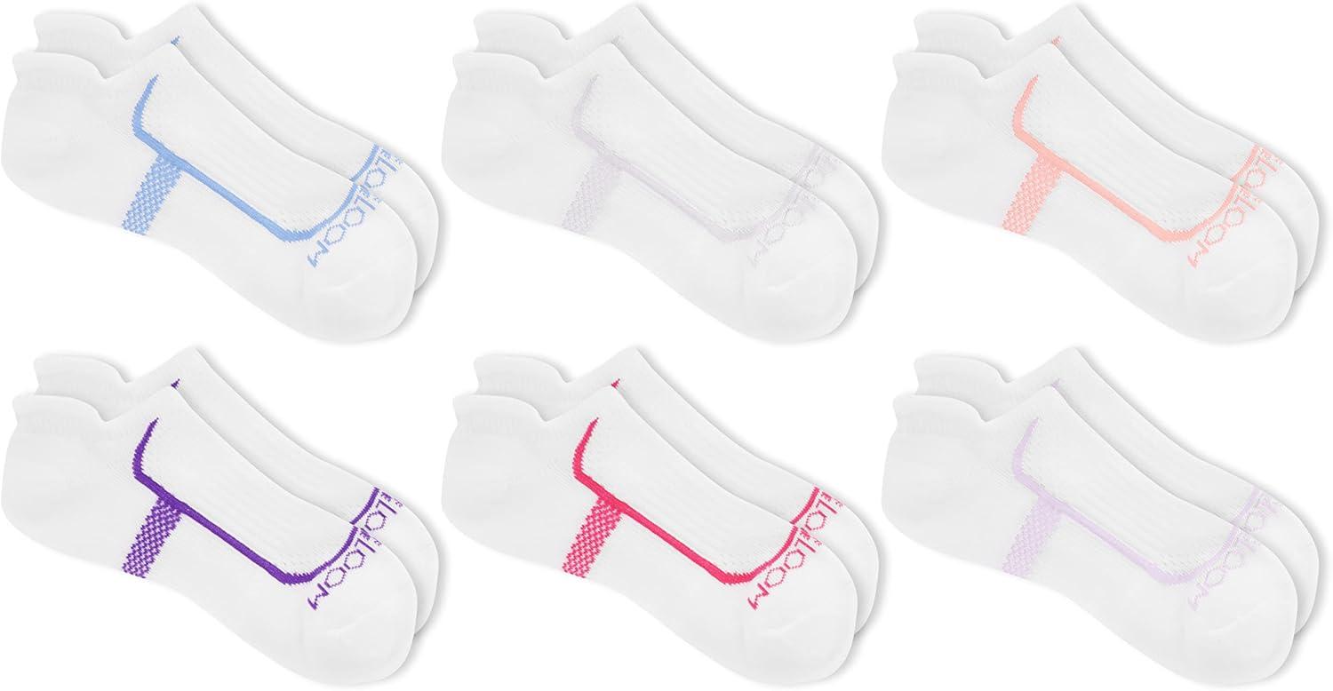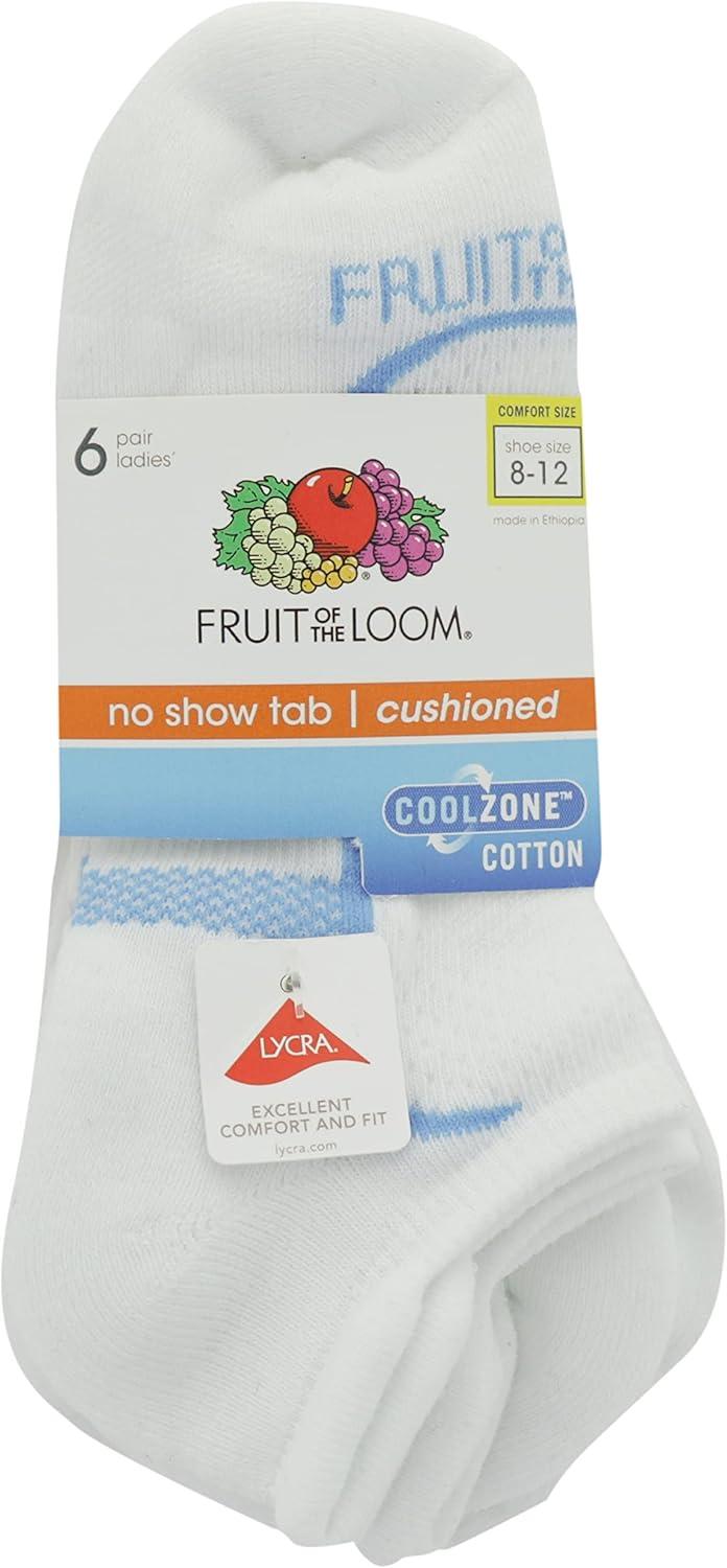 Designed for your active life, Fruit of the Loom Women’s CoolZone Cotton Socks blend classic cotton comfort and cooling technology for a difference you can feel with every step. Carefully made with softer, premium cotton yarn, these double tab women’s no show socks with extra cushioning in a convenient 6 pair pack have strategically placed breathable mesh ventilation to keep feet cool and comfortable throughout the day. Perfect for work or working out, every pair of our cotton socks for women wicks away moisture for dry, fresh comfort, while the classic white, black, and accent colors offer multiple matching options to easily wear with your favorite tennis shoes and sneakers. Enhanced non-slip arch support means the sock stays put for a snug, but not-too-tight performance fit you expect from athletic socks. Stay cool where it matters in thicker, padded cushioned cotton softness and make CoolZone no show socks for women your go-to everyday essential. Available in medium and roomier comfort shoe sizes, the cotton and polyester fabrication makes this softer women’s moisture wicking sock the easy choice at work or working out.