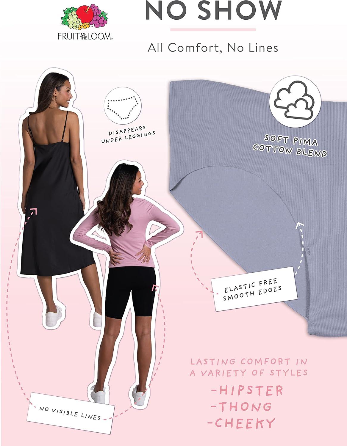 Pesky panty lines and irritating side seams are a thing of the past with Fruit of the Loom No Show Panties! Made with supima cotton and spandex for an elevated product with an amazing stretch that moves with you and fits perfectly to your shape. This new No Show collection comes in a modern cheeky bikini, hipster, and thong silhouettes. These wardrobe essentials are perfect for everyday wear or special occasions with their smooth seamless look under clothes and forever comfortable styling. They are sure to become your new go to!
