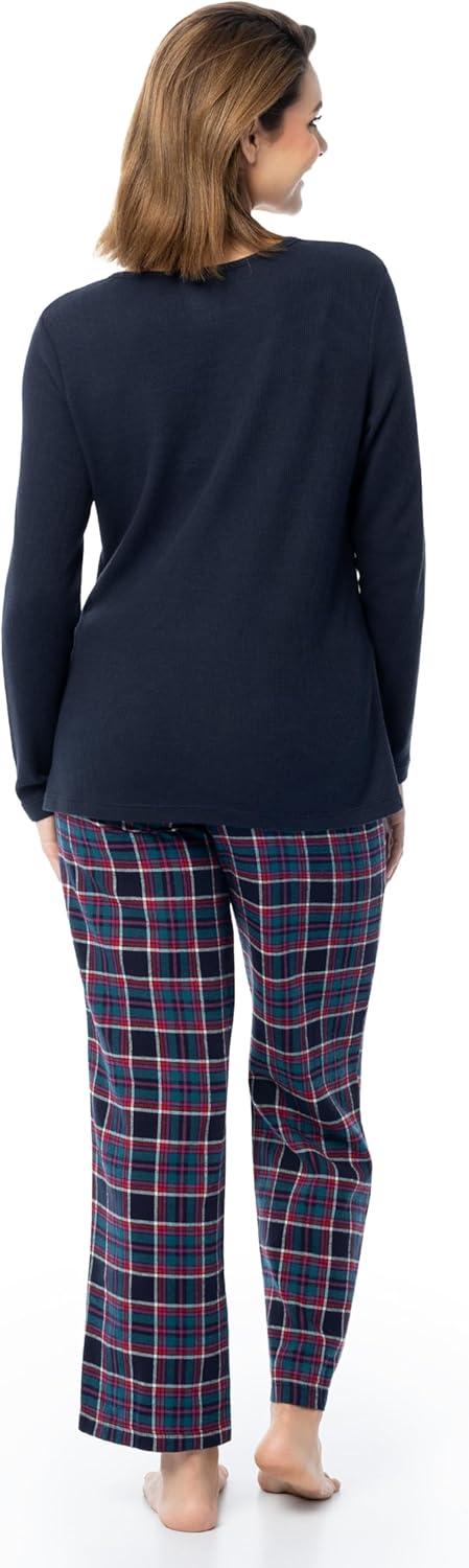 Fruit of the Loom Women’s Waffle V-Neck Top(Navy/Holiday Plaid)